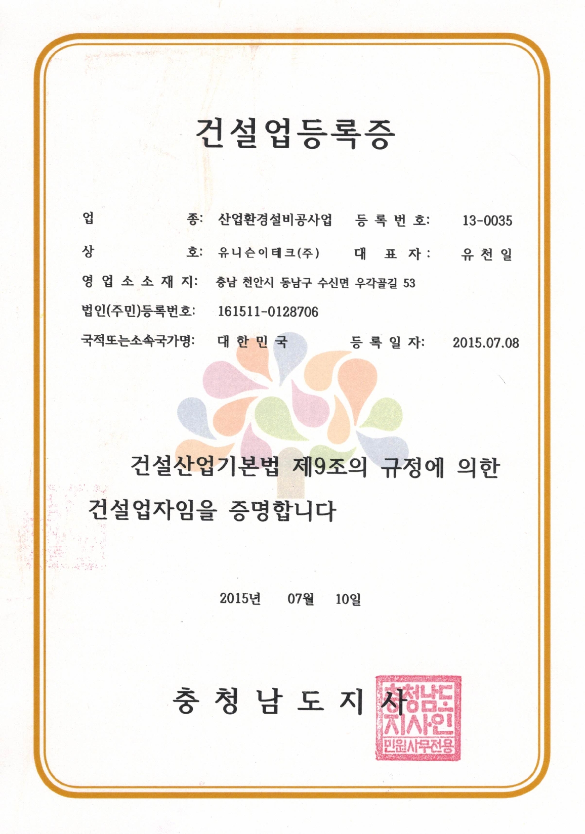 Unison eTech registered Industrial environment euipments work business license on July 18th, 2015.