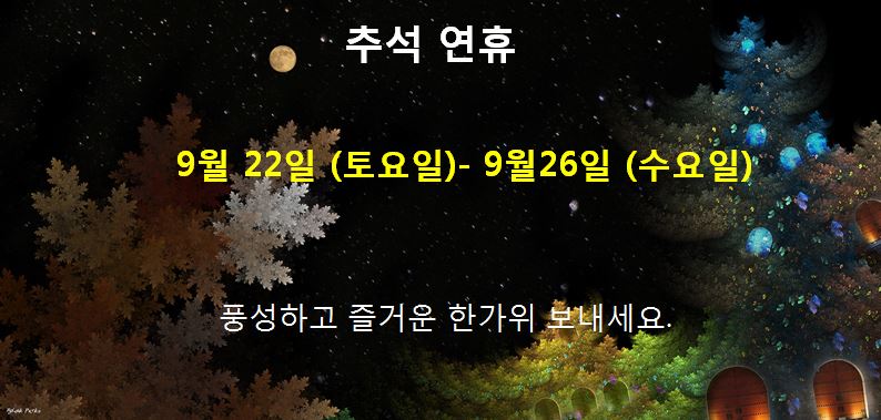 공지추석휴가 / 9월 22일(토요일) ~9월 26일 (수요일) 등록일 : 2018.09.12조회수 : 6777 이전글 여름휴가 공지 / 7월 30일(월요일) ~8월 3일 (금요일) 2018.07.17 다음글 [언론/보도] 유니슨이테크, 산업부 장관상ㆍ국무총리 표창 수상 2018.09.17 목록보기