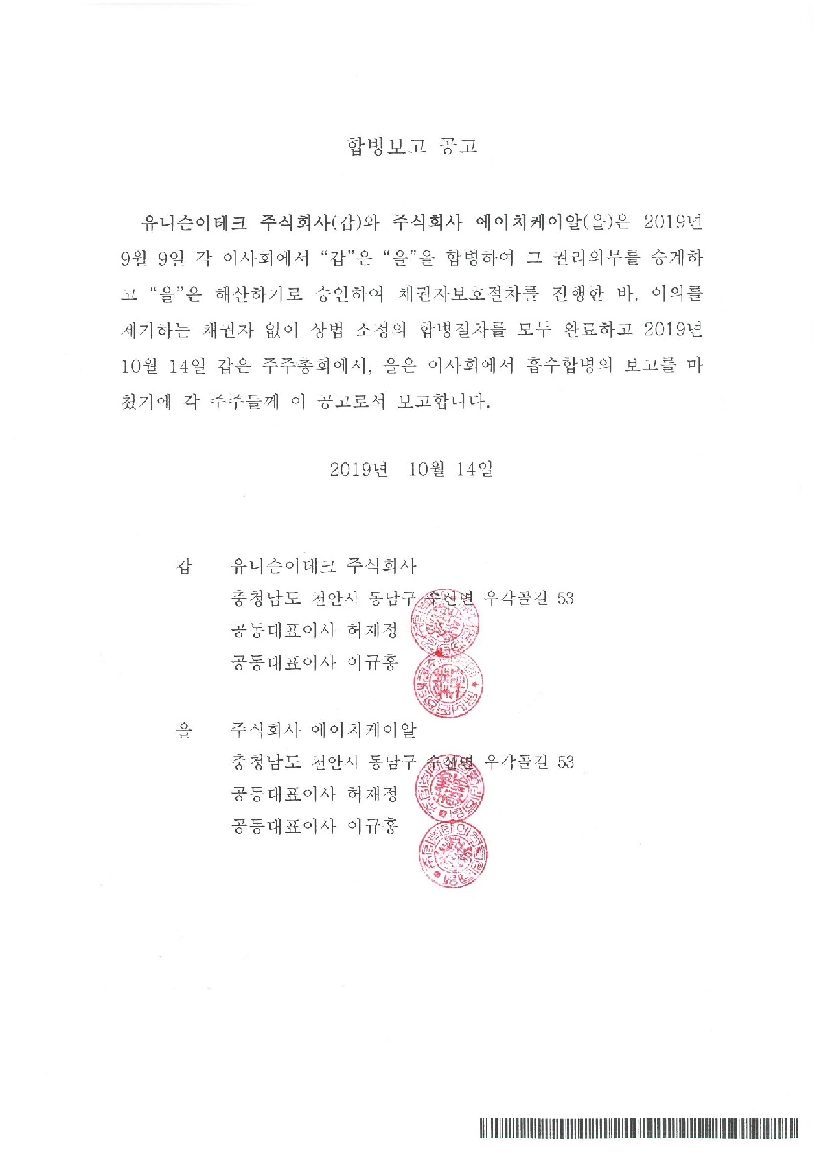 공지합병보고 공고 등록일 : 2019.10.14조회수 : 6560 이전글 합병 및 주권 제출 공고 - (주)에이치케이알 2019.09.10 다음글 누리플랜그룹 한마음체육대회 [2019.10.11] 2019.10.18 목록보기