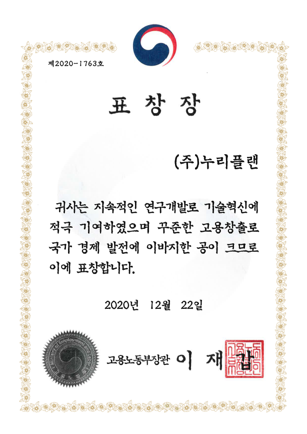 공지[언론/보도] 누리플랜, 고용노동부 장관상 수상 [2020.12.22]