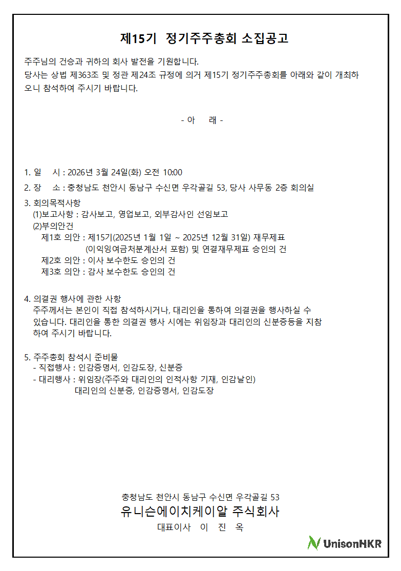 공지[공고] 제15기 정기주주총회 소집공고 등록일 : 2026.03.16조회수 : 103 이전글 [언론/보도] 이진옥 유니슨HKR 대표 “경쟁력 및 지속가능성 제고…2027년 IPO 추진” 2025.07.16 다음글 없음 목록보기